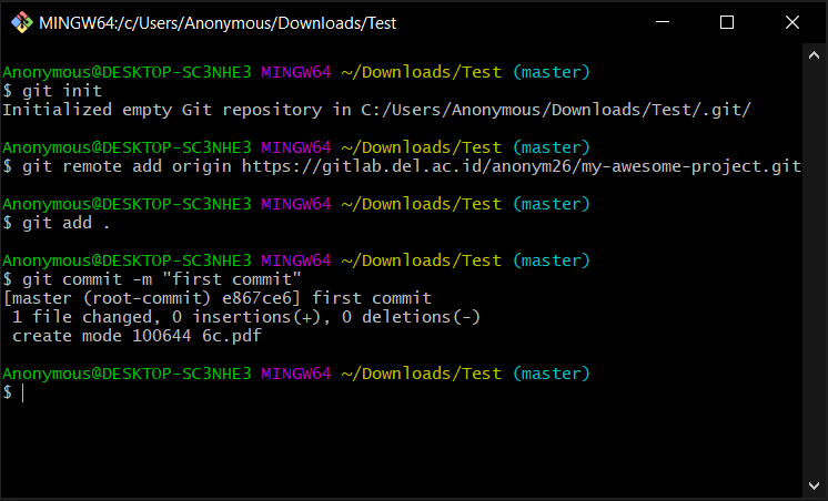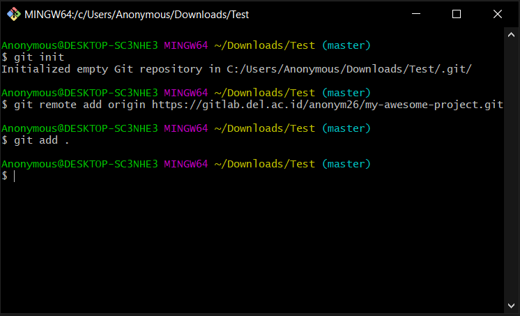 12. Lalu ketik : git remote add together origin <alamat yang kita salin tadi> pada nomor 7 — — — — — — — — — — — — — — — — — — — — — — Contoh : git remote add origin https://gitlab.del.ac.id/anonym26/my-crawly-project.git