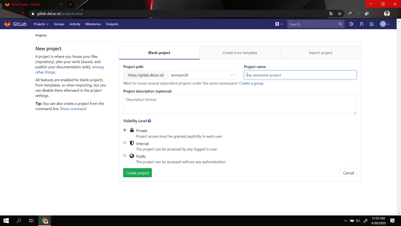 Public -> Semua orang dapat melihat tanpa perlu logi ke GitLab