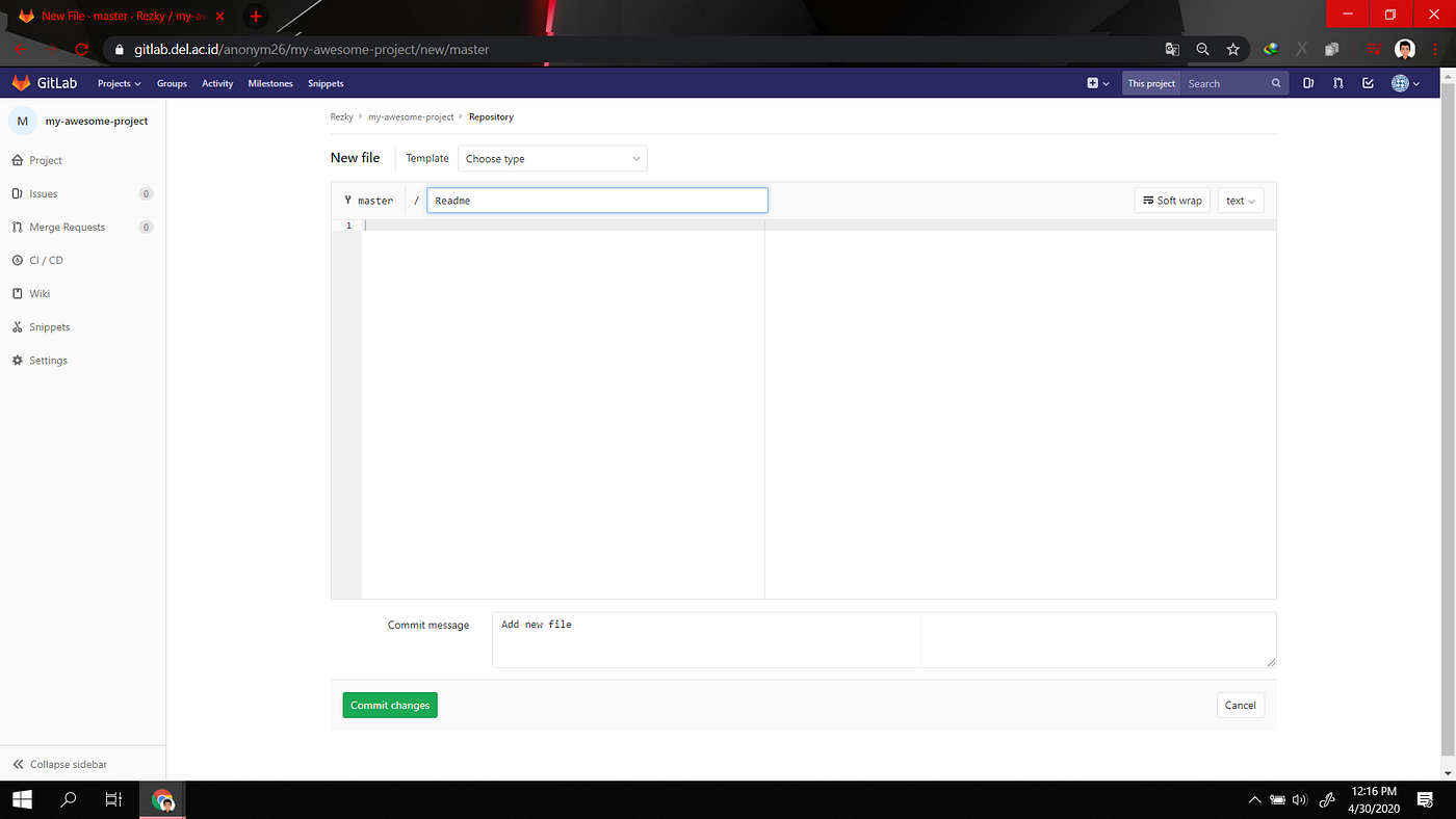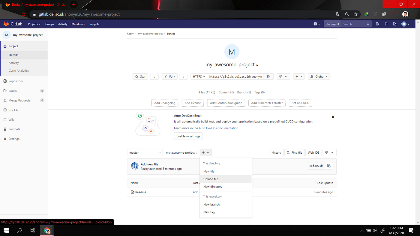 Pada kesempatan kali ini saya akan berbagi cara Upload File Ke Repository Project GitLab. Ada 2 metode dalam Upload File ke GitLab : Dengan menggunakan fitur yang terdapat dalam GitLab tersebut dan Dengan menggunakan GitBash (Git). Pertama kita bahas dengan menggunakan fitur dalam GitLab kemudian kita bahas dengan menggunakan Gitbash (Git).